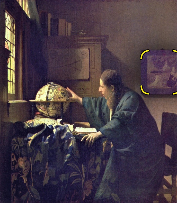 Астроном Вермеєра оточений атрибутами своєї професії: небесним глобусом, компасом, астролябією. Але в правому верхньому кутку ми бачимо частково обрізану рамою картину, сюжет якої нагадує історію про порятунок Мойсея. Цікаво, що ця ж картина з’являється і в іншій роботі Вермеєра – «Молода жінка, яка пише листа, і її служниця». Дослідники досі сперечаються, чию картину процитував художник. Однозначно те, що наявність картини в картині робить цей твір не просто жанровою сценою, а наводить на метафізичні роздуми.