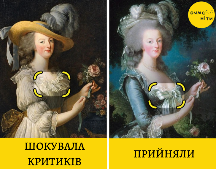 Елізабет Віже-Лебрен була талановитою французькою художницею. Але щоб залишатися затребуваною, їй іноді доводилося перемальовувати картини на догоду звичаям, що панували в той час. Хвиля критики обрушилася на художницю через портрет Марії-Антуанетти: вона мала нахабство зобразити королеву в сукні з матеріалу, який зазвичай використовували для спідньої білизни. За кілька днів Віже-Лебрен була змушена зняти картину з виставки і замінити її ідентичним портретом, але з більш традиційною сукнею.