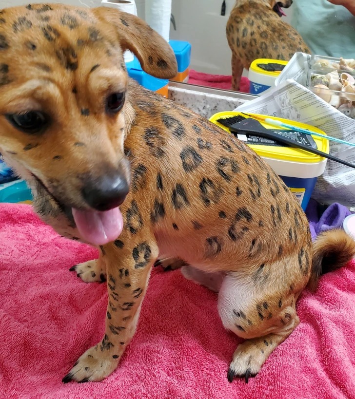 «Моє цуценя демонструє свіжий «апгрейд» від грумера. Так-так, це безпечна фарба для вихованців – тепер він модник!»