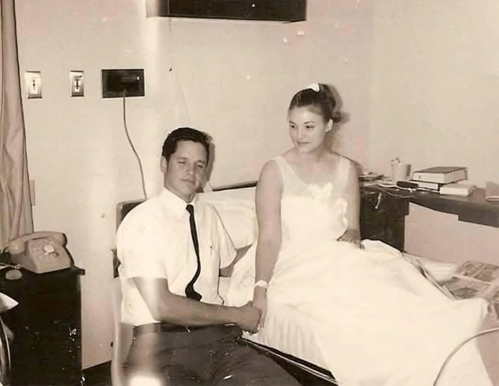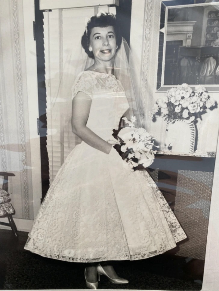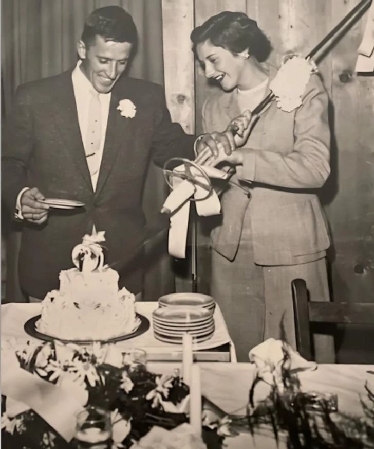 «Весілля моїх бабусі і дідуся, яке вони відзначали на гірськолижній базі. Вони розрізали свій святковий торт ножем, прив’язаним до лижної палиці. 1955 рік»