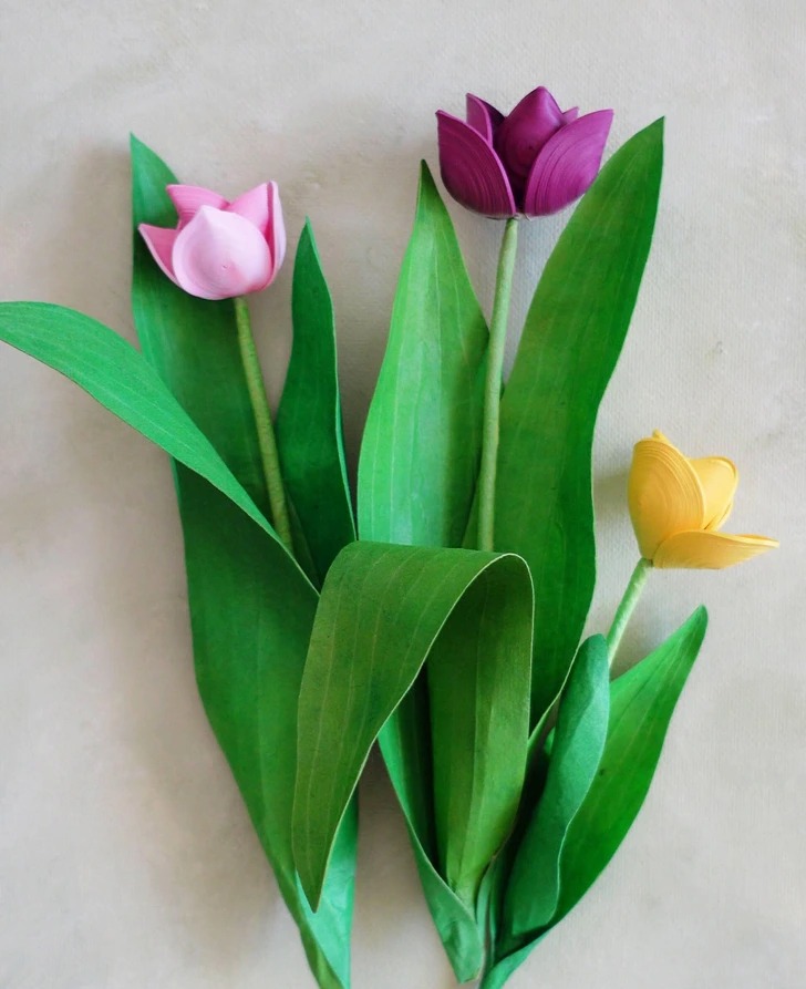 «Мій перший подібний досвід — я скручувала дуже вузькі смужки паперу, щоб зробити ці тюльпани»