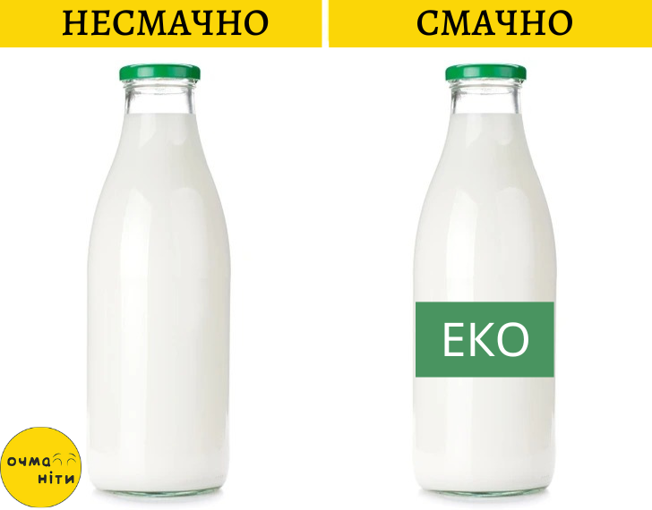 Не дарма дизайнери приділяють так багато уваги упаковці продуктів. Вона не лише стимулює продажі, але й робить їжу привабливішою на смак для споживача. Наприклад, для дітей йогурт у знайомій, улюбленій упаковці здаватиметься смачнішим, ніж той самий йогурт у незвичному стаканчику. Те ж саме працює і для дорослих: продукт із позначкою «Екологічно чистий» сприймається як більш приємний на смак, ніж аналог без інформації про його користь.