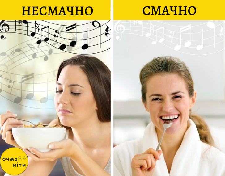 Надто гучний звук може «згладжувати» смак страви. Наприклад, у барі з голосною музикою їжа здається менш солоною або солодкою. Натомість спокійна музика посилює смакові відчуття, роблячи страву більш насиченою. Лондонський шеф-кухар Хестон Блюменталь використав цю особливість: у своєму ресторані він подає морепродукти разом із iPod, на якому лунає шум моря.