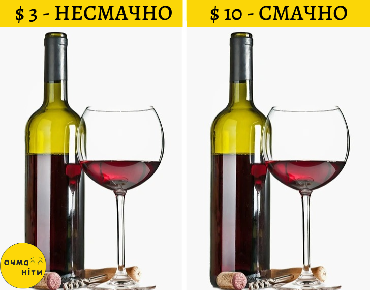 Чим дорожча їжа, тим смачнішою вона здається. Так, наприклад, якщо ви вип’єте 2 келихи різного вина, а потім дізнаєтеся вартість обох, то, швидше за все, віддасте перевагу тому напою, що дорожчий. Вся справа в тому, що ми звикли вважати, що дорого — значить якісно. Саме ця психологічна установка впливає на ваші смакові рецептори.