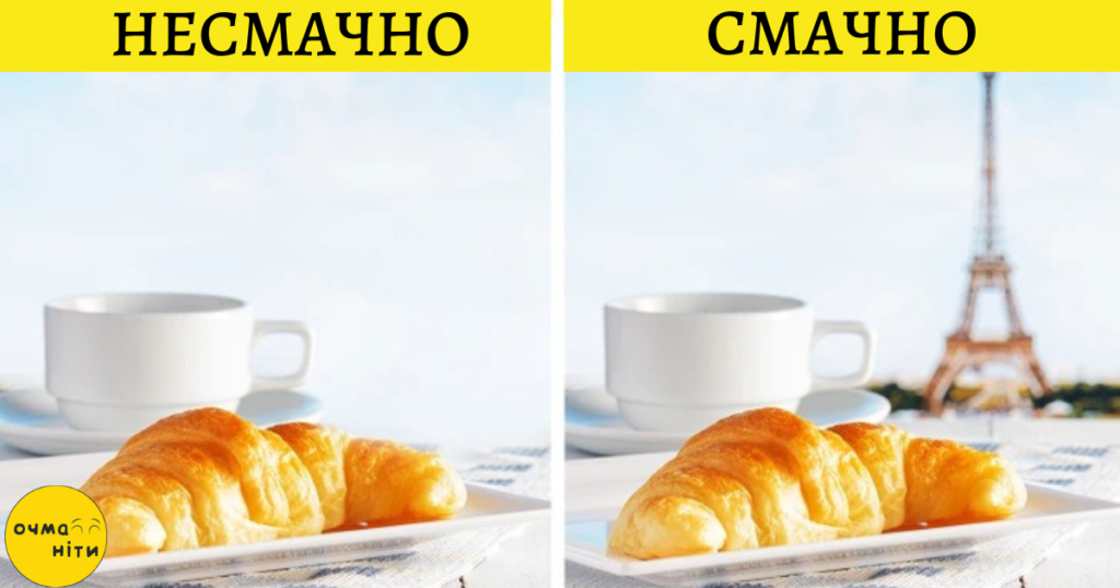 На нашу думку про страву може вплинути місце, де ми їмо, а також стереотипи, які нам відомі: найкращий круасан готують у Франції, хачапурі — в Грузії, а бургер — в Америці. І навіть якщо в кав’ярні біля вашого будинку випічка нітрохи не гірша, ніж у самому Парижі, смачнішою вона вам здасться саме за кордоном. Навколишня атмосфера доповнює смак, і ми відчуваємо його яскравіше на підсвідомому рівні.
