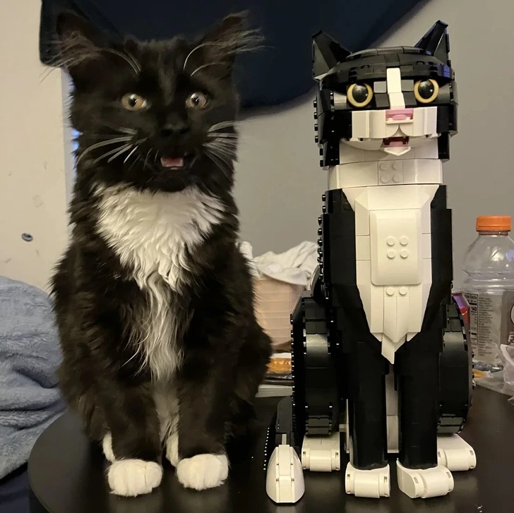 «Не можу перестати сміятися! Я щойно закінчила збирати Лего-кота, і мій кіт вирішив підіграти, відкривши рот в найідеальніший момент!»