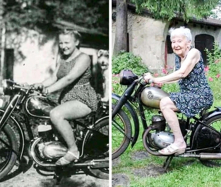 У тому ж місці, на тому ж байку. Різниця у фото — 71 рік! Ех, всі ми хочемо в такому віці бути, як ця жінка