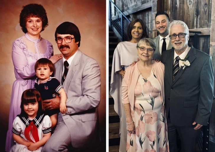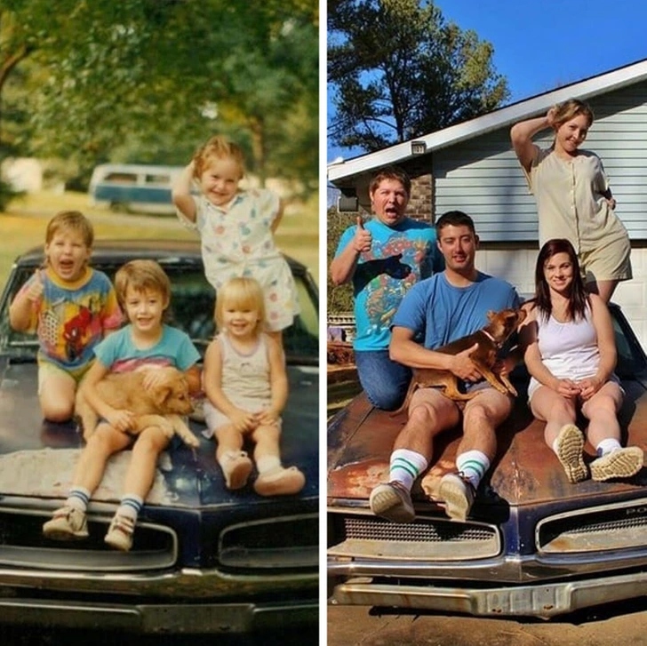 Кажуть, що не можна двічі увійти в одну і ту ж річку, але героям нашої добірки це вдалося. Ми знайшли 17 пар фотографій, на яких між кадрами пролетіли десятиліття, змінилися епохи і виросли діти. А чоловік з дружиною так само кохають одне одного, друзі все так само вірні, а улюблена бабуся ще міцніше обіймає свою онуку. У кожного героя все ще збереглися той самий вогник в очах і щира посмішка. Приготуйтеся до порції доброї ностальгії.