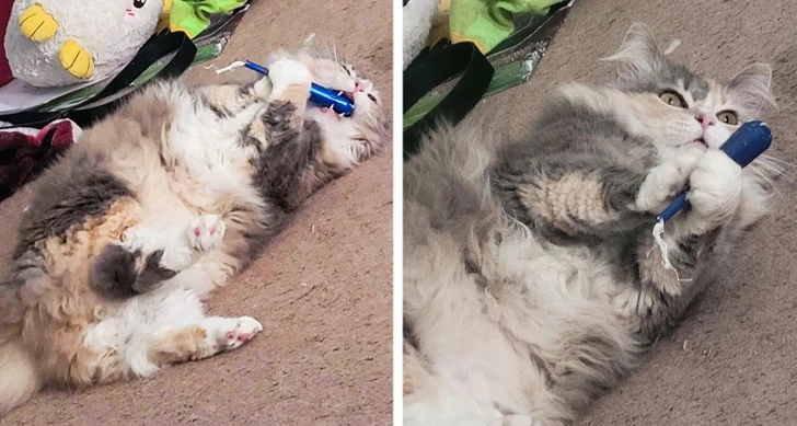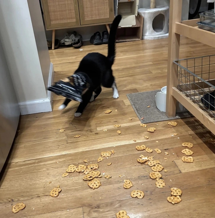 «Знову спіймала її з вкраденим тампоном. А буквально через хвилину вона вже залізла в холодильник. Ця кішка — просто маленьке пухнасте стихійне лихо!»