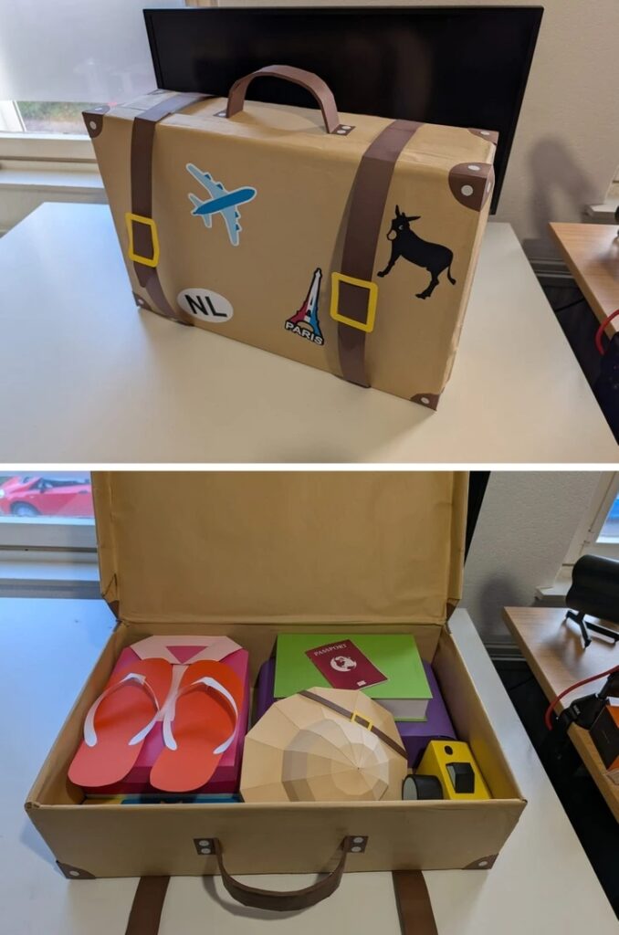 «Допомогла нареченому з його сюрпризом для таємного Санти. Картонна дорожня валіза з туристичним приладдям всередині»