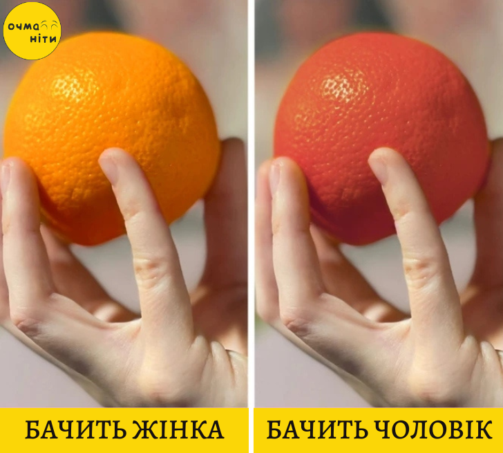 Наприклад, апельсин може здаватися чоловікові більш червоним, ніж жінці. Трава для жінок майже завжди зеленіша, тому що чоловікам зелені предмети бачаться більш жовтими.