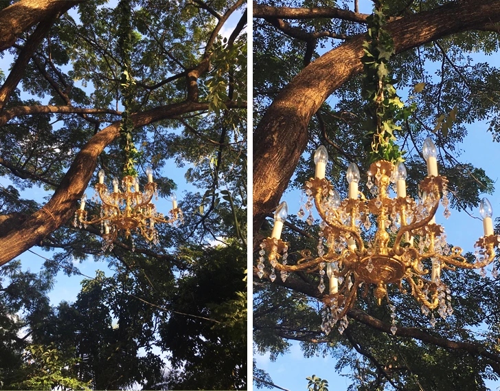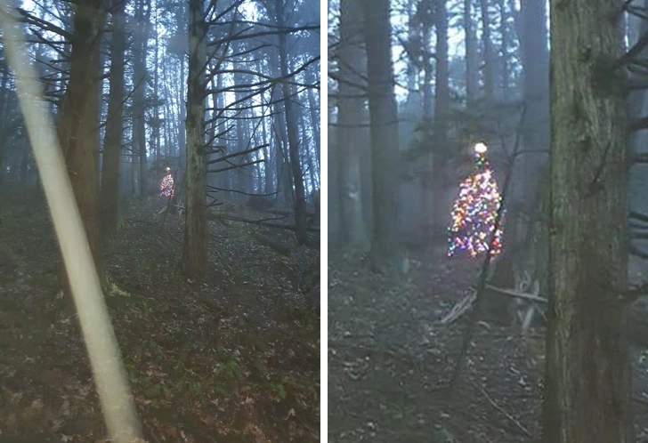 «Ця повністю прикрашена різдвяна ялинка знаходиться посеред лісу. Живлення, здається, йде від міні сонячних батарей»
