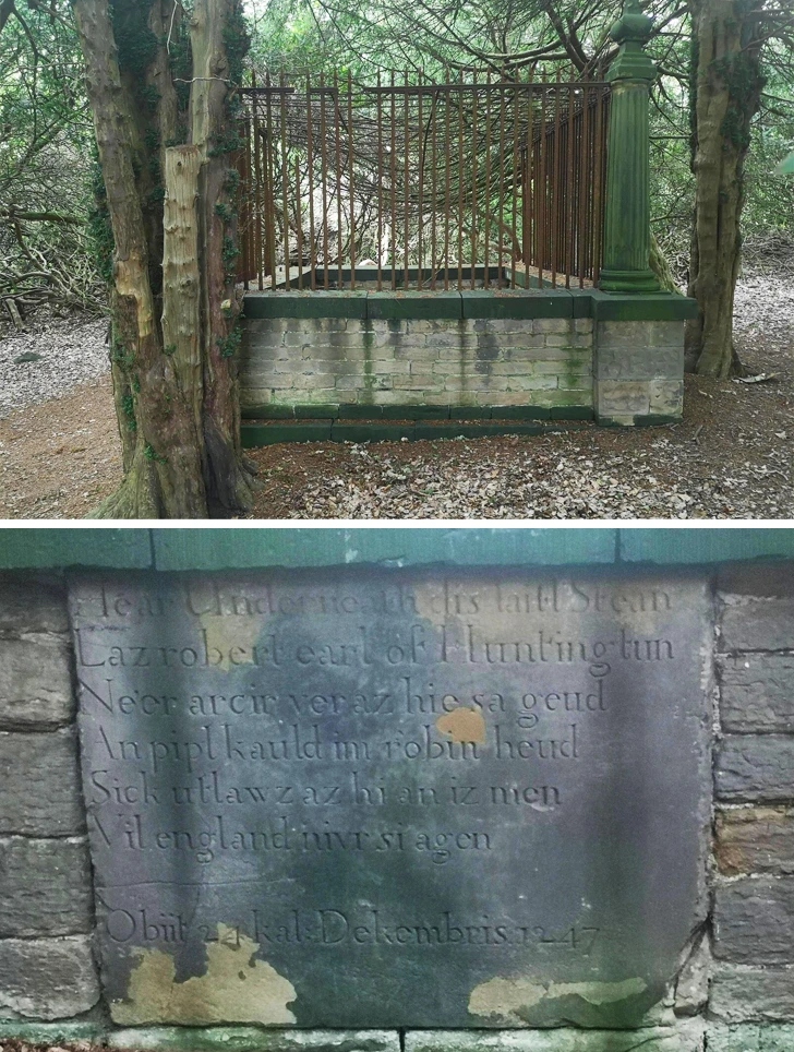 Текст на могильному камені: «Тут, під цим маленьким каменем, лежить Роберт, граф Гантінгтонський. Не було лучника вправнішого за нього. І люди називали його Робін Гуд. Таких розбійників, як він і його люди, Англія більше ніколи не побачить. Він помер 24 грудня 1247 року».