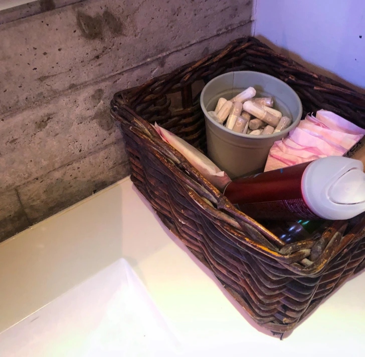 У багатьох популярних закладах у жіночому туалеті можна зустріти кошики з лаком для волосся та гігієнічними засобами.