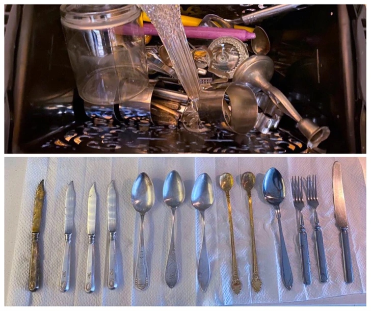 Вечеряю в ресторані, приходить повідомлення від подруги: «Дивись, що знайшла на смітнику». Спочатку думала не псувати апетит, а коли відкрила повідомлення, втратила дар мови: у старій коробці вона знайшла цілу купу столового срібла.