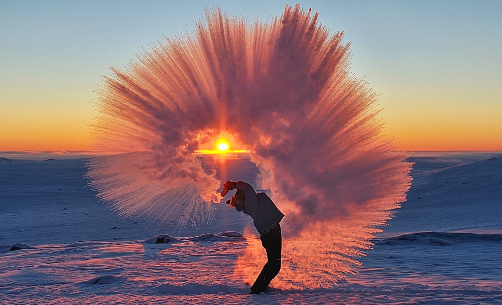 Фотографу з Онтаріо Майклу Девісу вдалося зробити приголомшливий кадр, коли його напарник виплеснув гарячий чай з термоса при температурі -40 градусів. При такій низькій температурі вода, а особливо дрібні бризки, замерзають миттєво, залишаючи за собою неймовірний крижаний шлейф. Фото було зроблено в 20 км від Північного полярного кола, де Девіс працює фотографом в дослідницькій компанії.