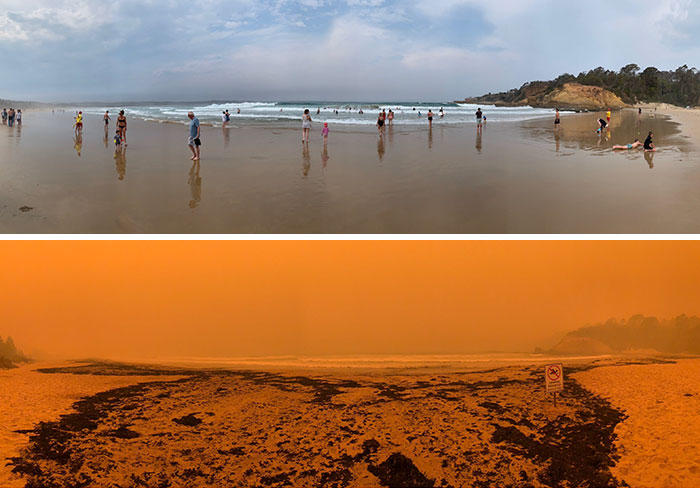 Пляж Tathra Beach До і після диму та попелу з прилеглих пожеж. Чорне сміття на фотографії знизу – це обпалена деревина