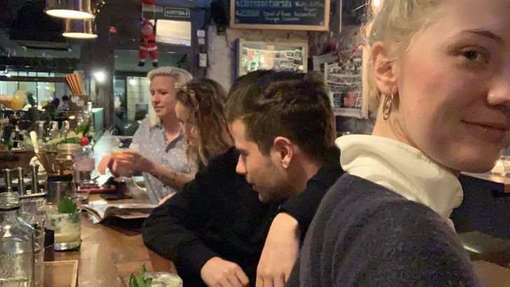 В який бік повернута голова чоловіка на фото? Того, який з лисиною.