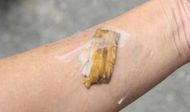Завдяки наявності в своєму складі натуральних олій і ферментів, бананова шкірка може значно полегшити біль від сонячних опіків, подряпин і саден, а також заліковує рани. Приклади бананову шкірку до місця опіку або укусу внутрішньою стороною, потім зафіксуй її на деякий час. Можна повторити кілька разів для більш швидкого загоєння.