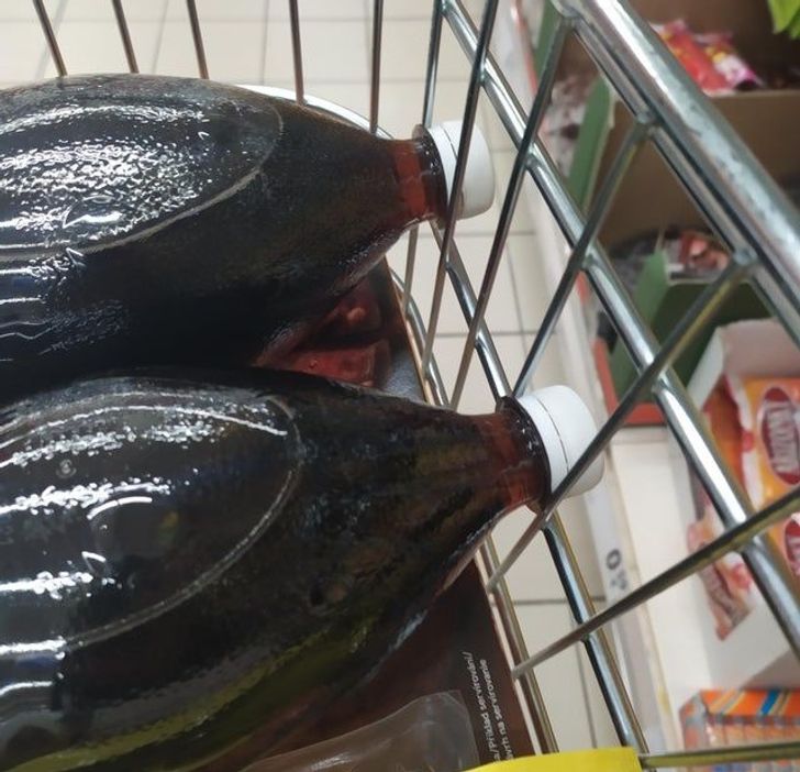 Якщо в супермаркеті пляшки катаються по візку, просто засуньте їх кришки між отвори в корзині