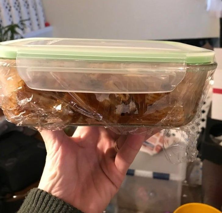 Якщо не хочете мити контейнер, просто покладіть на дно харчову плівку, а вже зверху – їжу