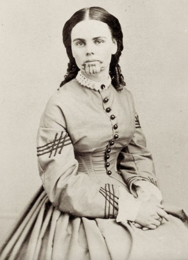 Олів Оатман була викрадена у віці 14 років індіанцями, які вбили сім’ю Олів на її очах. Індіанці роками тримали її в рабстві, поки не перепродали її племені Мохаве. Мохаве прийняли Олів як повноправного члена свого племені і витатуювали їй на підборідді традиційні знаки їх племені. Пізніше Олів вдалося повернутися в рідні краї. Продавши свою захоплюючу історію, вона отримала великий прибуток і дожила до 65 років.
