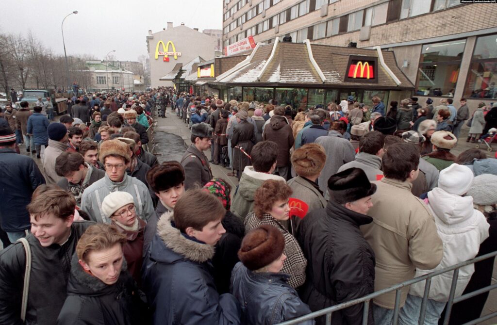 Сотні людей з нетерпінням чекають відкриття самого першого ресторану McDonald’s на пострадянському просторі в 1990 році.