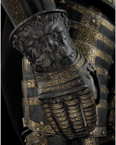 Обладунки отримали свою назву через левові морди, які розташовані на всіх виступаючих частинах. Це чудове творіння приписується збройовим майстрам з родини Негроні, в XVI столітті їх майстерня в Мілані славилася на весь світ. Левиний обладунок часто подорожує по різних виставках, постійно ж він прописаний в Королівському збройовому музеї англійського міста Лідс.