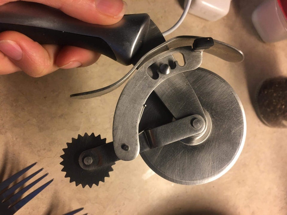 Це коліщатко використовується для нарізки піци в службах доставки, щоб коло був розділене на шматочки, але вони при цьому не відривалися один від одного при транспортуванні.