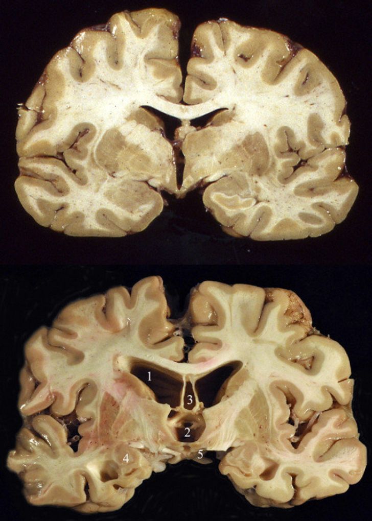 Розріз нормального людського мозку (вгорі) і мозку колишнього гравця в американський футбол (внизу)