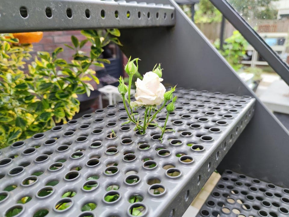 Роза в саду моєї мами пробилася крізь отвір в сходах