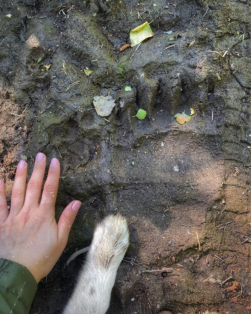 Лапка собачки і рука людини на відбитку лапищ бурого ведмедя