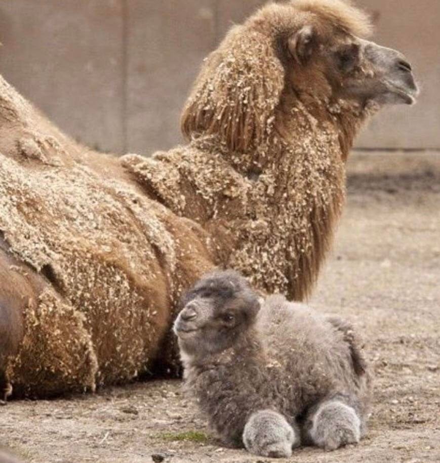 Малюк-верблюденя декількох днів від народження на тлі дорослого верблюда
