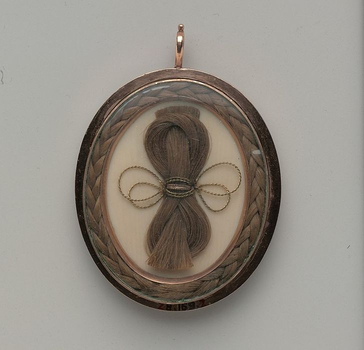 Підвіска з пасмом волосся, 1795 рік. Подібні прикраси з нагадуванням про коханих були популярні в Вікторіанську епоху