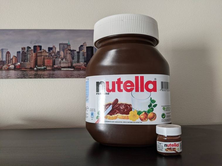 Банку на 5 кг пасти Nutella та баночка на 25 грам. Дві межі фасування цієї смакоти.