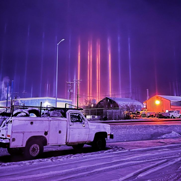 Такі світлові стовпи на Алясці утворюються завдяки відображенню світла на гранях крижаних кристалів, що ширяють у повітрі