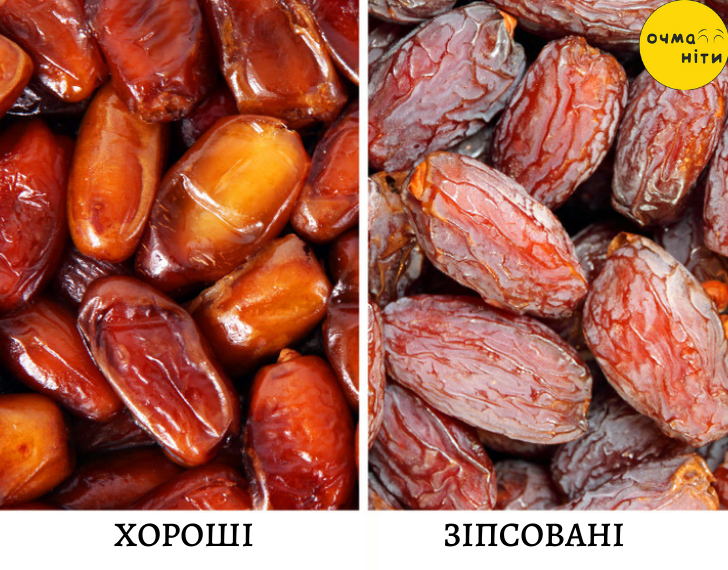 Свіжі фініки можуть бути зморщені, але не сильно, також вони не повинні бути занадто жорсткими. Найкраще, коли сухофрукти виглядають м’ясистими та мають злегка глянсову шкірку. На них не повинно бути кристалів цукру і білих плям, тому що їх наявність говорить про псування, що вже почалося.