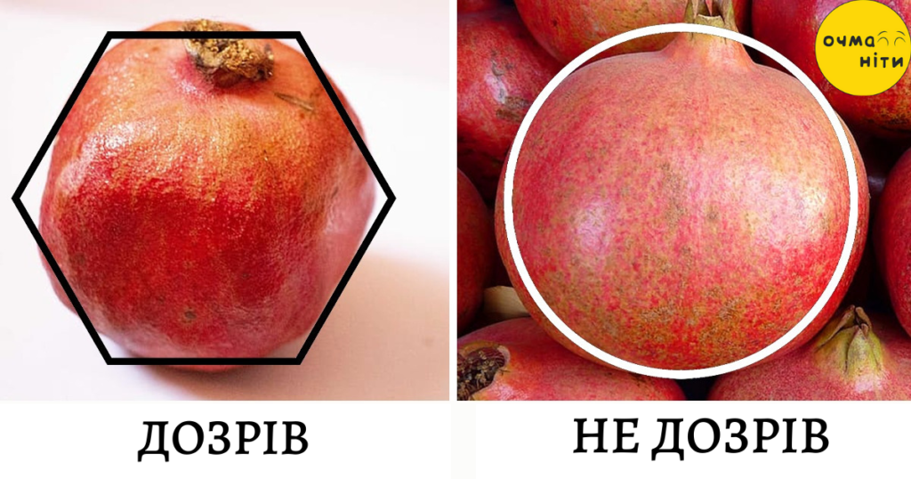 Іноді покупка граната затьмарюється тим, що всередині він виявляється блідим та несолодким. Щоб такого не сталося, ось на що варто звернути увагу: за формою плід повинен бути не ідеально круглим, а мати кути а ще ознаками зрілості є гладкість і пружність шкірки.