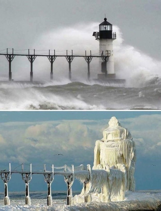 14. Маяк в Мічигані до і після крижаної бурі