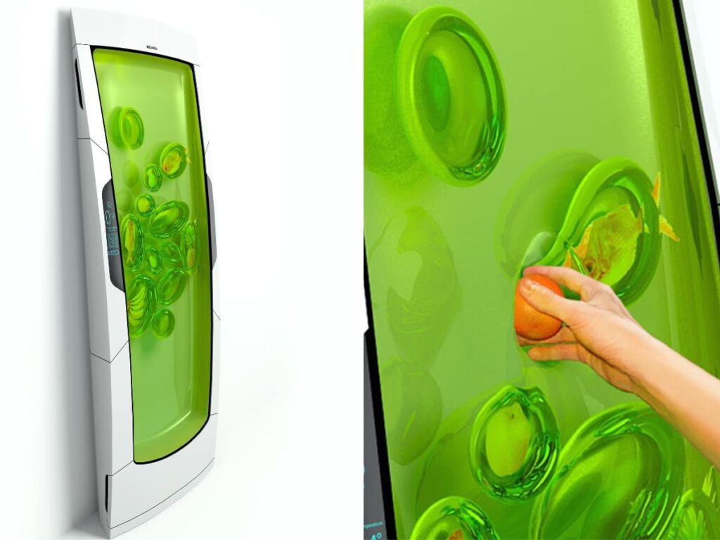 Інноваційний холодильник вигадав дизайнер Юрій Дмитрієв. Його технологія мало чим нагадує звичний пристрій для зберігання продуктів. Холодильник майбутнього позбавлений дверей, полиць, відділень, а його ємність наповнена спеціальним біополімерним гелем. Субстанція дбайливо утримує продукти та охолоджує їх.