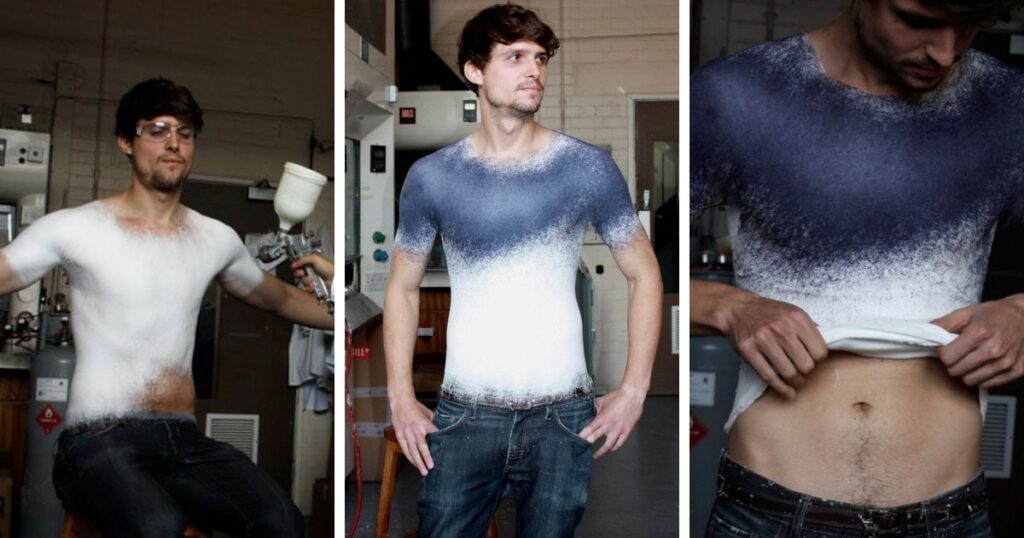 Іспанський модельєр Манель Торрес та професор Пол Лакхем створили першу у світі рідку тканину, яку можна розпорошувати з балончика прямо на тіло людини. Рідина твердне і застигає за частки секунди. В результаті людина отримує абсолютно нову річ, яка ідеально сидить на її фігурі. На створення однієї футболки йде не більше 15 хвилин. Набридлі вбрання не потрібно викидати. Їх можна легко утилізувати, опустивши в спеціальний розчин.