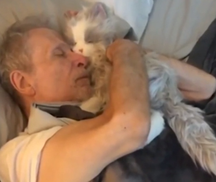 На фото насправді іграшка-кіт. Чоловік, який страждає на захворювання Альцгеймера, може засинати, лише когось обіймаючи