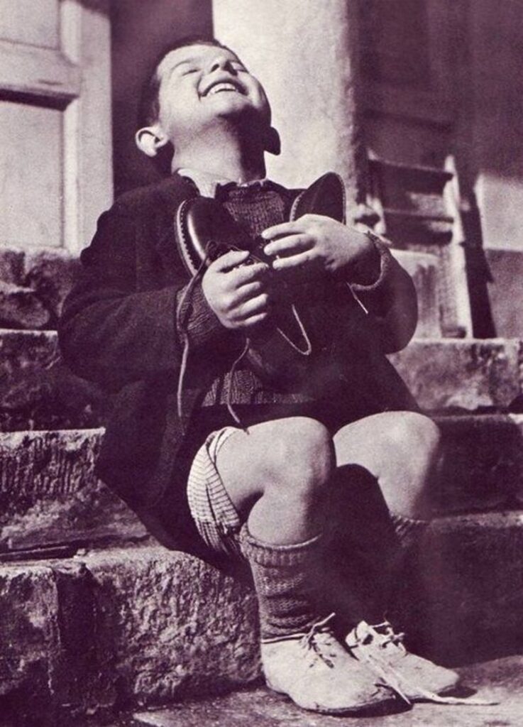 Момент щастя. Хлопчикові подарували нову пару взуття. Австрія, 1946 рік.
