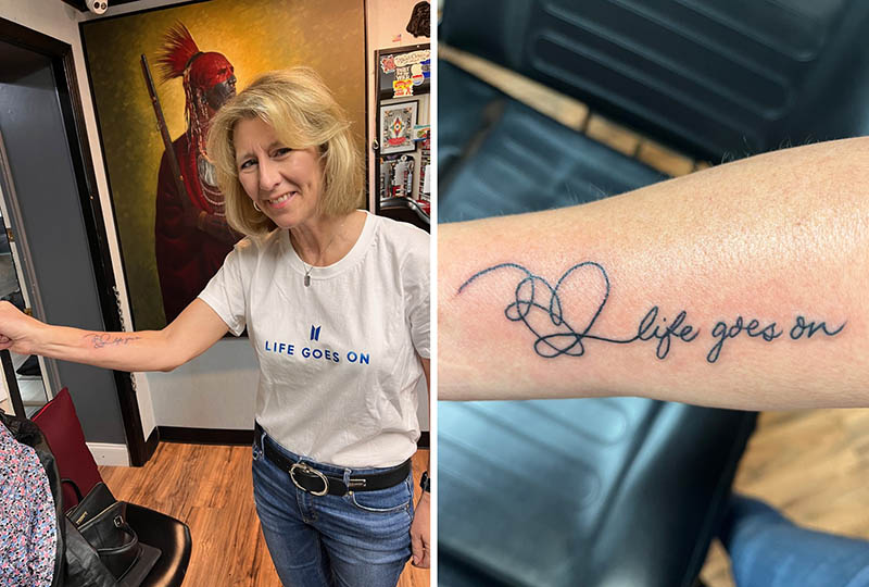 “На своє 60-річчя я подарувала собі татуювання. Вже 10 років, як помер мій чоловік, і до нормального життя мене допомогла повернути пісня “Life Goes On”. Життя дійсно продовжується, нагадування про що я і зробила собі на руці”