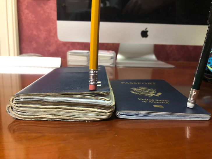«У мого тата, цілком імовірно, найтовстіший паспорт у світі — у ньому 222 сторінки. Праворуч 52-сторінковий паспорт для наочності»
