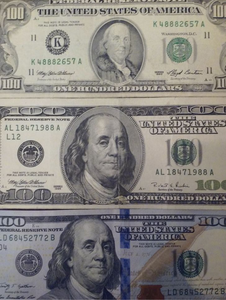 Раніше на 100-доларовій купюрі Бенджамін Франклін був зображений у хутряному пальті (пізніші банкноти для порівняння)