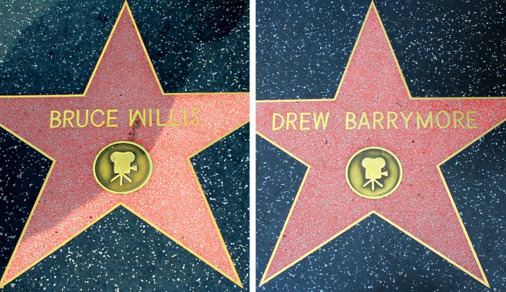 Літера W на іменній зірці Брюса Вілліса на «Алеї слави» в Голлівуді насправді перевернута буква M (фото зірки Дрю Беррімор для порівняння)