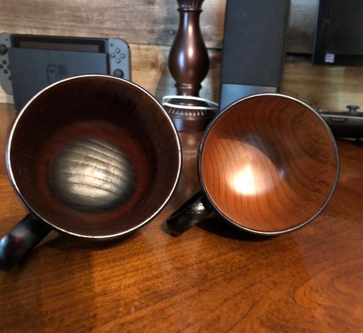 “Дерев’яна кавова чашка, яку я використовую три роки (ліворуч), порівняно з абсолютно ідентичною новою чашкою”
