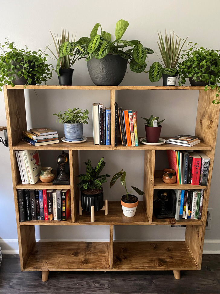 «Ми з моїм хлопцем зробили цю книжкову полицю, і я буквально закохана у неї. Нижні полиці порожні, бо ми маємо кішок»