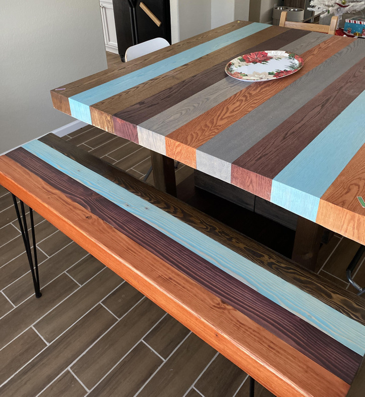 «Мій перший масштабний проект – стіл та лавочка з різнокольорових дубових плашок. Залишилося тільки покрити лаком чи смолою»